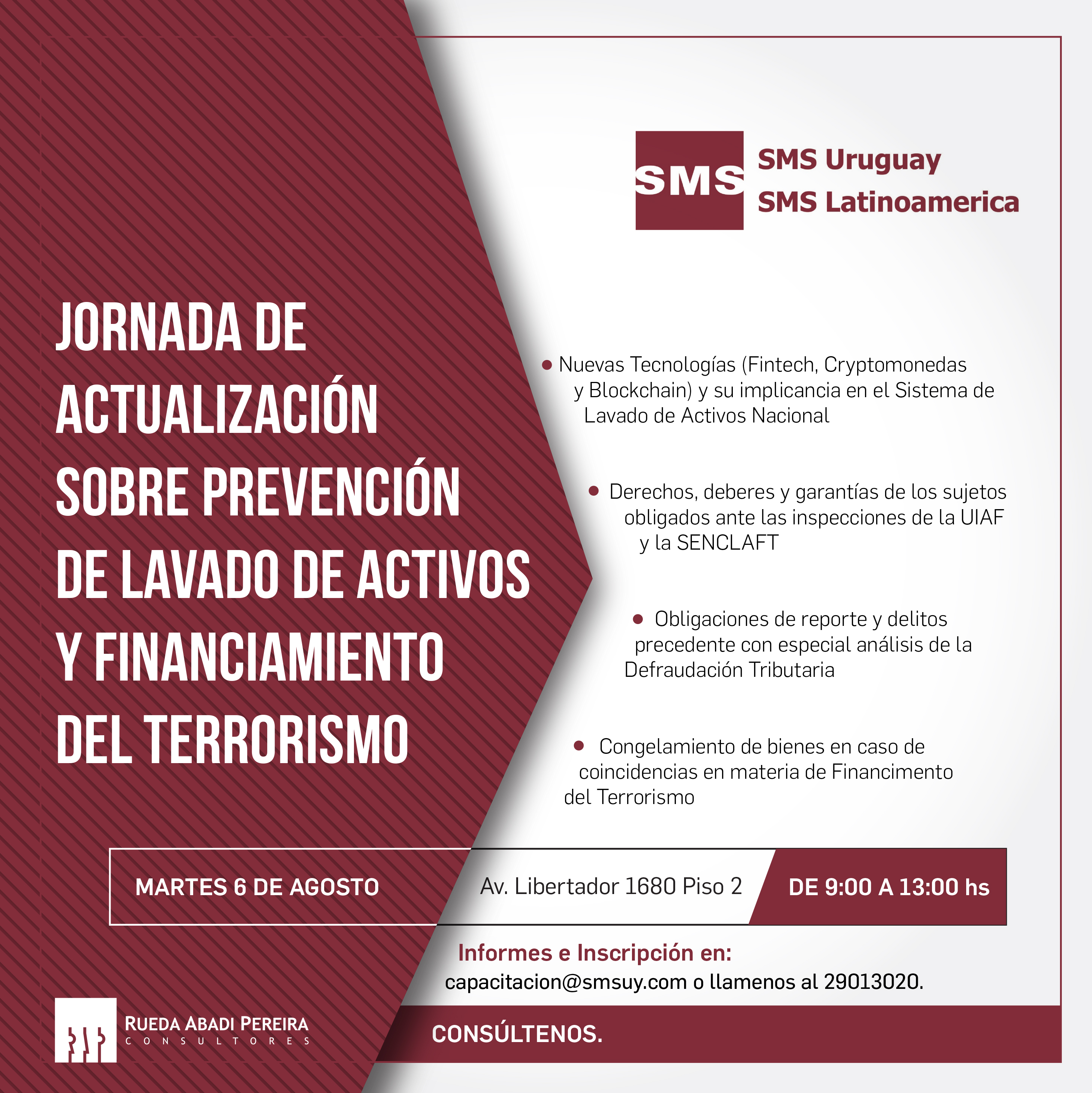 El evento se desarrollará en una jornada matutina donde analizaremos 4 temas de total actualidad previa introducción general del Sistema Nacional de Prevención de Lavado de Activos y Financiamiento del Terrorismo, a saber: